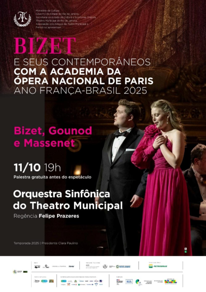 Depois de mais de duas décadas sem vir ao Brasil, em comemoração ao ano França-Brasil, o Theatro Municipal do Rio de Janeiro celebra a parceria com a Ópera de Paris apresentando o programa ‘Bizet e seus Contemporâneos’ e traz, pela primeira vez ao país, alguns de seus maiores cantores líricos. Com o Patrocínio Oficial Petrobras, sob a regência do maestro titular da Orquestra Sinfônica do TMRJ, Felipe Prazeres, o Concerto contará com a OSTM em uma refinada seleção de romances, melodias, peças líricas e duetos, revelando diferentes facetas da obra de Georges Bizet para além das mais conhecidas. São quinze composições do autor, todas da segunda metade do século XIX, colocadas em diálogo com obras de seus contemporâneos Massenet e Gounod. O repertório será interpretado pelo corpo de residentes da instituição, formado por cantores e músicos vindos de diversas partes do mundo. O espetáculo, que estreou no Palais Garnier em janeiro deste ano, foi calorosamente recebido pelo público francês. A apresentação no Theatro Municipal do Rio de Janeiro será única, no dia 11 de outubro, sábado, às 19h. Ingressos disponíveis através do site www.theatromunicipal.rj.gov.br. Haverá uma palestra gratuita, às 18h, antes da récita.