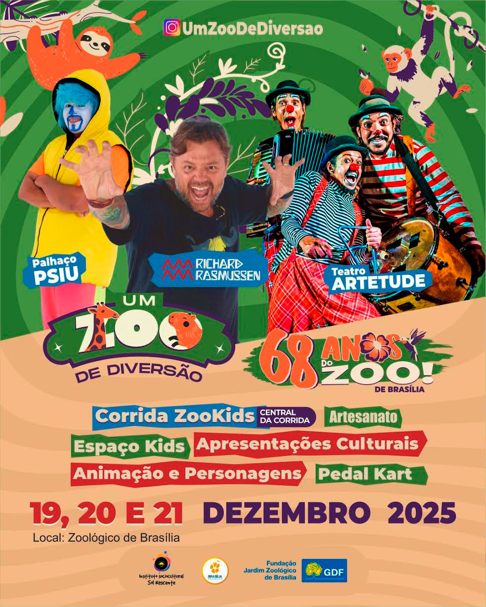 No mês de aniversário de 68 anos do Jardim Zoológico de Brasília, criado em 1957 como equipamento público fundamental para a conservação da biodiversidade local, ocorre o projeto “Um Zoo de Diversão” com uma grande programação para todos os públicos nos dias 19, 20 e 21 de dezembro, a partir das 9h da manhã. O evento reforça o papel do Zoo como espaço de lazer, cultura e educação ambiental, aproximando a comunidade do patrimônio natural do Distrito Federal.