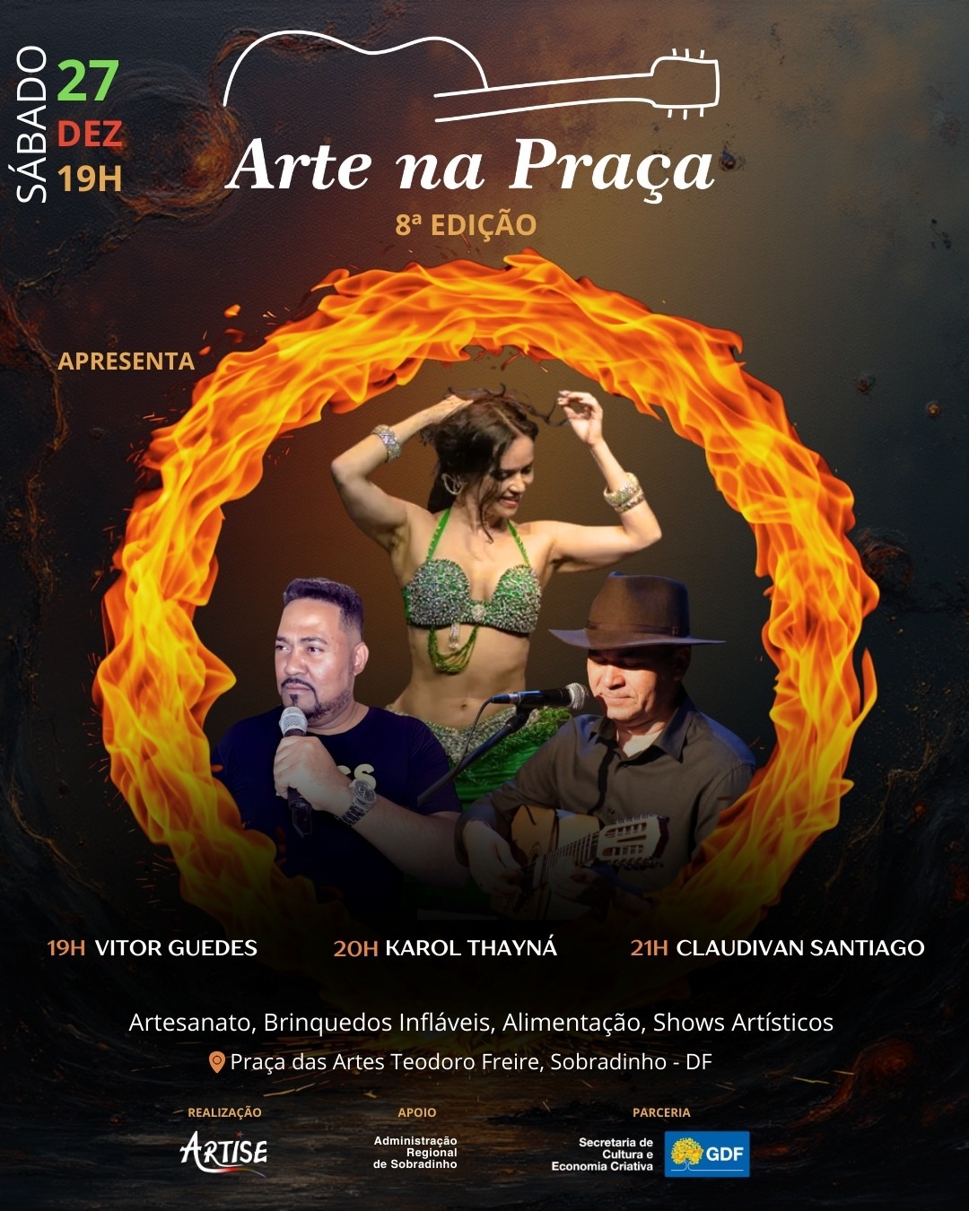 A Associação Artise de Arte, Cultura e Acessibilidade realiza a 14ª noite da 8ª edição do projeto Arte na Praça neste sábado (27/Dez), em Sobradinho. O evento gratuito ocupa a Praça das Artes Teodoro Freire, a partir das 19h, com foco na revitalização do espaço público e promoção de artistas locais.