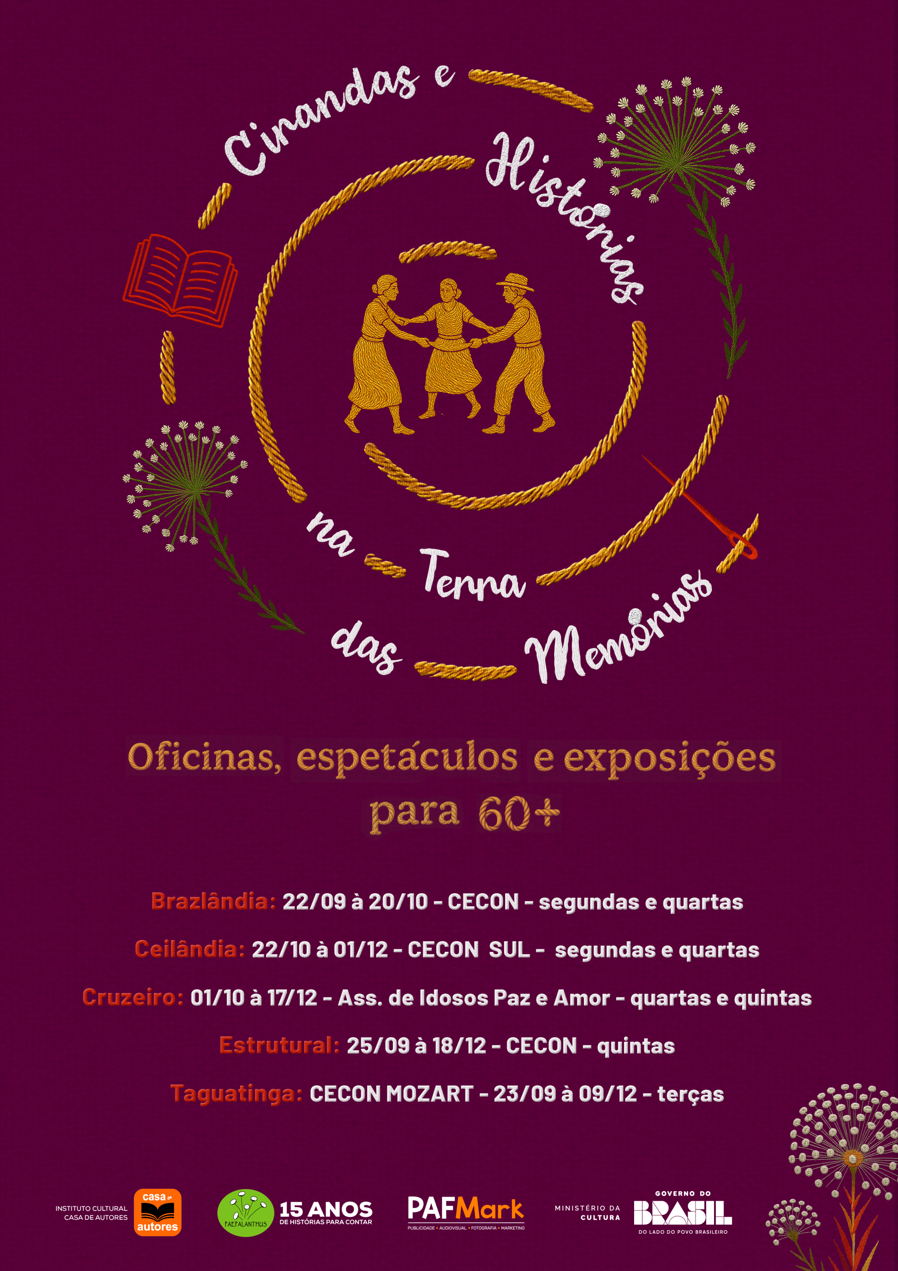 De setembro a dezembro, em Brazlândia, Ceilândia, Cruzeiro, Estrutural e Taguatinga, os Centros de Convivência vão pulsar cultura, alegria e memória. Serão semanas nas quais a literatura irá  se misturar às cantigas populares e a imaginação vai costurar novas formas de estar no mundo. Em cada região, como toda ciranda que se abre em roda, o projeto vai se despedir com espetáculos literários onde os participantes se tornam protagonistas da cena.