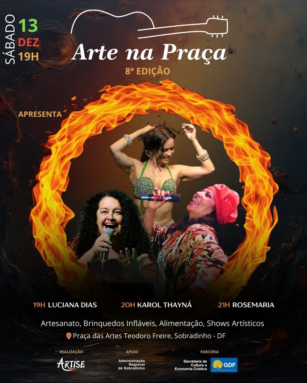 A Praça das Artes de Sobradinho receberá neste sábado, 13 de dezembro, a 12ª noite da atual temporada do Projeto ARTE NA PRAÇA VIII.O evento, dedicado ao talento e à força feminina,contará com os shows de Luciana Dias (Tia Lu) e RoseMaria, além da performance especial da bailarina Karol Thayná.