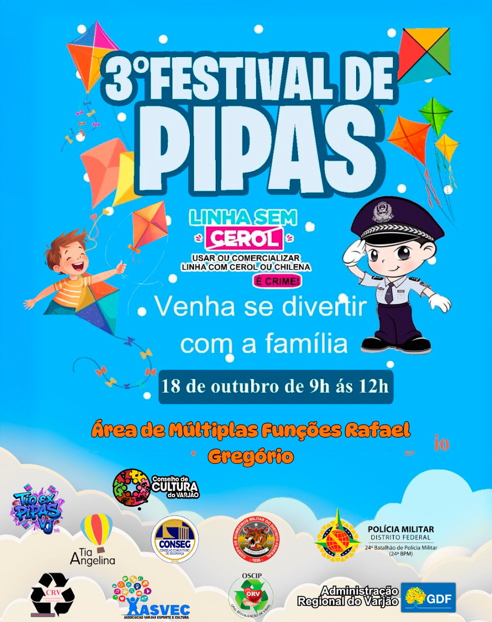 A cidade do Varjão receberá em 18/Out o 3º Festival de Pipas, uma celebração já tradicional pelo Dia das Crianças, que acontecerá no Espaço de Múltiplas Funções Rafael Gregório. O evento, que atrai centenas de famílias da região, oferecerá uma programação diversificada com distribuição de pipas, pipoca, algodão doce, brinquedos infláveis e um espaço kids com pintura de rosto e “cabelo maluco”, além de oficinas e um torneio de futsal.