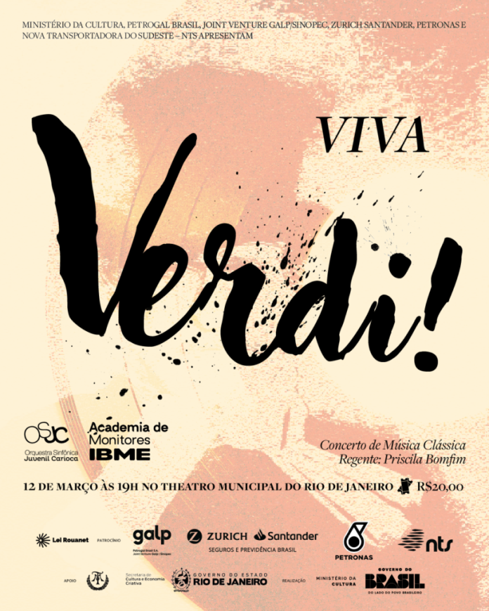 Uma noite de gala dedicada à grandiosidade da ópera italiana, em homenagem aos 125 anos do legado do compositor Giuseppe Verdi(1813–1901). Esta é a proposta do concerto que a Academia de Monitores e Orquestra Sinfônica Juvenil Carioca (OSJC) vão apresentar em 12 de março (quinta), às 19h, no Theatro Municipal do Rio de Janeiro,soba regência da maestra Priscila Bomfim. Os ingressos custam R$20 (inteira) e R$ 10 (meia-entrada).